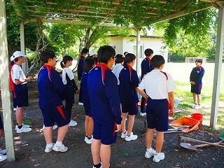 全校生活美化委員長から今日の活動の確認があり、各班の担当場所で、草抜き、肥料まき、耕しなどを行いました。