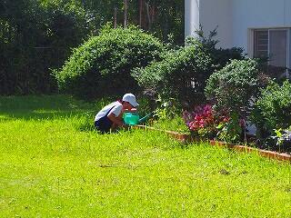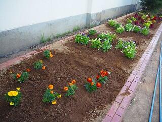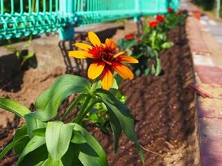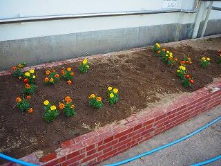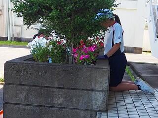 体育館南側の花壇は、上に「ひさし」があるので、雨が降ってもなかなか水が届かないことも多い場所です。たっぷり水を撒いてもらえて、花もイキイキしています。