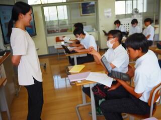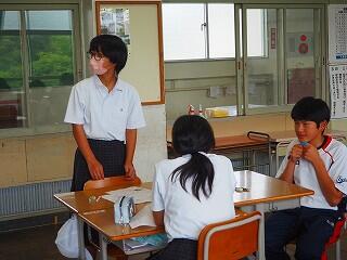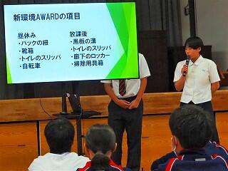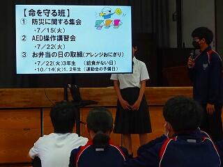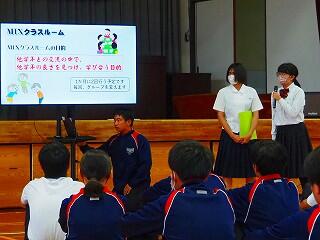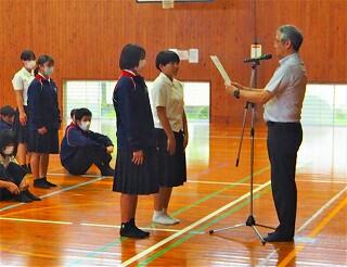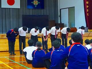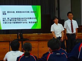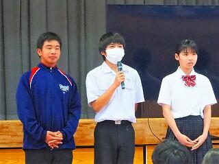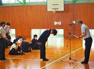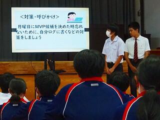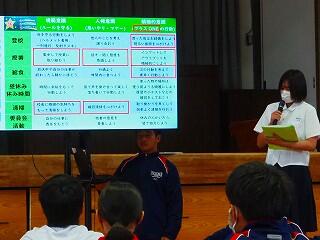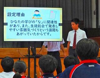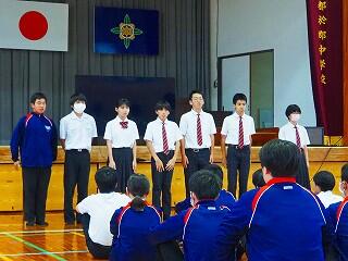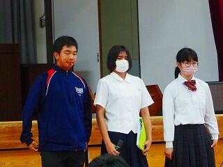 全校生活美化委員長から、活動の大事な確認がありました。「人数の少ない学校だからこそ、人任せにしていたら進みません。一人一人が積極的に活動に取り組んで、都於郡中の最後の1年を、花いっぱい咲かせましょう!」