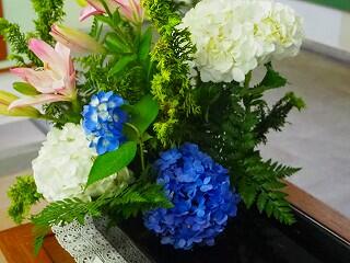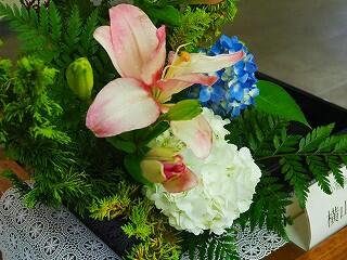 花材:スカシユリ、アジサイ、レザーファン、ヒバ