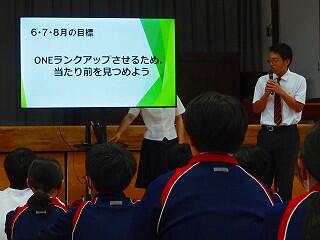 生徒総会でみんなで話し合って、都於郡中のLAST1年の方向性を「ONEランクアップ」のチャレンジをしていくことと決まりました。
