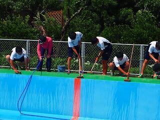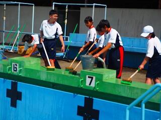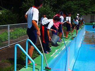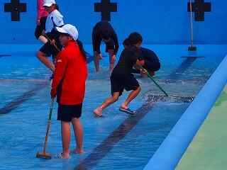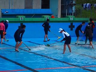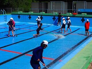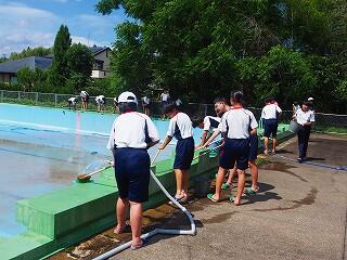 「プールの修繕工事の関係で、予定より1週間ほど遅れてのプール開きとなりました。とても良い天気の中、久しぶりの水泳の授業でみんな楽しく取り組んでくれました。来年はこの時期に、このような姿が見られないことになります。みんなで、正しく、楽しく、水泳の授業を進めていきます。」