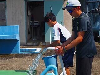 途中、ホースに亀裂が入っているところを発見!しっかりテープを重ねて巻いて修繕もしてくれました。協力して作業も素早い!!