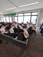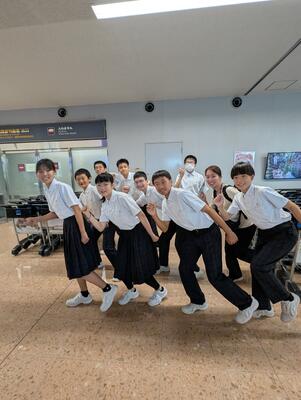 「みんなでルートを守って楽しんで、充実した修学旅行にしてきます。保護者の皆様、朝早くからいろんな準備や送迎などありがとうございました。行ってきます!!」