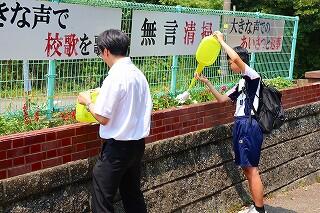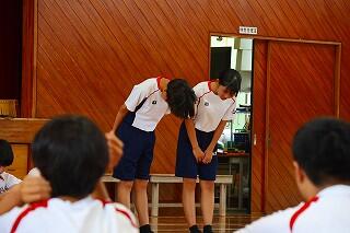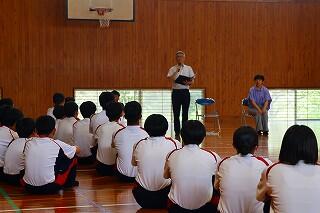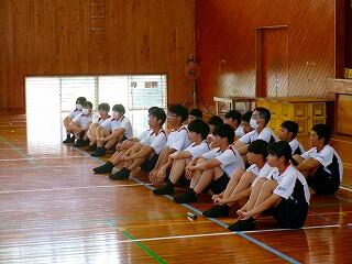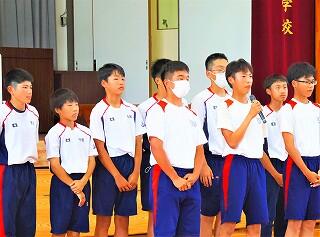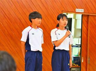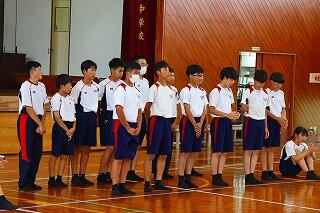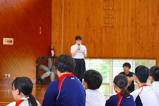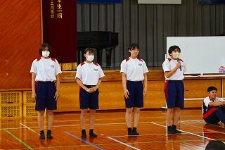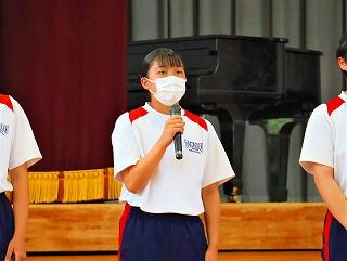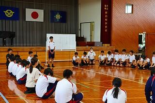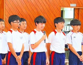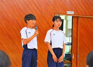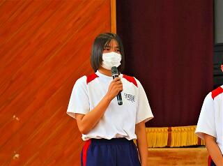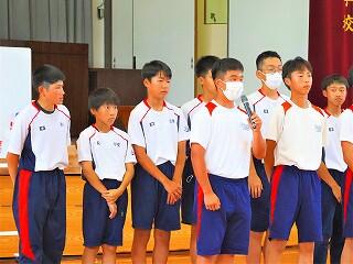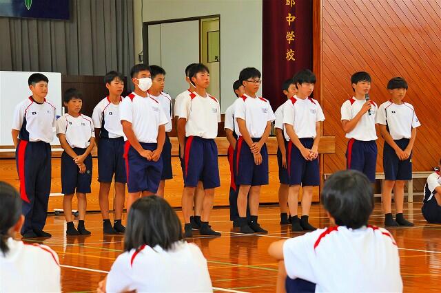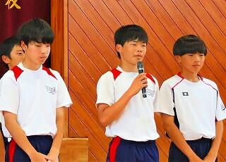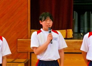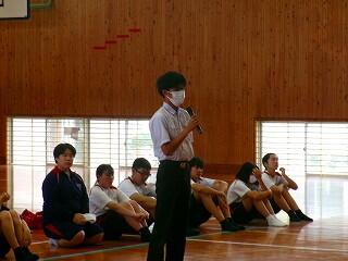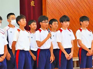 「先だっての地区中体連の大会の時に、応援に行かれた保護者の方々や地域の方々から『一生懸命に頑張る姿に感動しました!』、『一緒に応援することができて良かったです!』と、たくさん声をかけていただきました。それだけ、皆さんが応援される生徒になったということです。それは、自分たちの頑張る姿があるからこそ、見ている人も一生懸命に応援したくなるということです。自信を持ってください。今回は県大会、選抜大会に出る部活動の人たちの大会ですが、大切なのは全力を出し切ること、そして、あいさつやルール、マナーといった『礼』を大切に参加して、『感謝の気持ち』を大事にして参加してほしいと思います。皆さんの健闘を祈ります。」