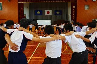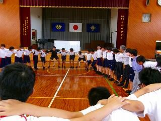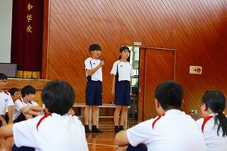 生徒会の企画運営により、昨年度から取り組んでいます。都於郡中の規模のメリットを生かして、全学年をMIXしての縦割り班で編成し、朝の会を行っています。