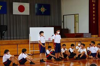 いよいよ、都於郡中の代表チームの発表の番です。フロアーで仲間の発表を、ドキドキしながら見守っています。