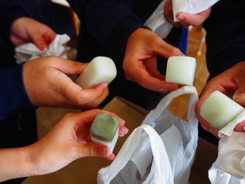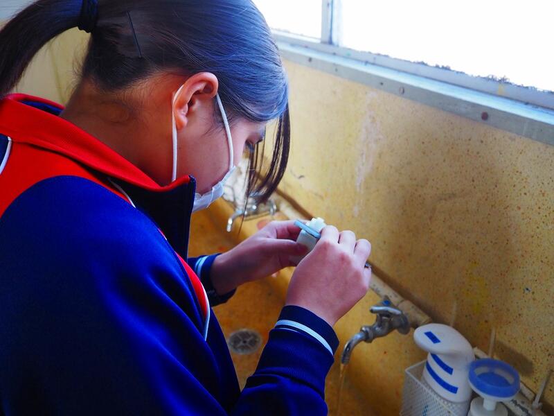 自分の名前を自分でデザインして彫った「篆刻」です。仕上げのみがき剤を付けて、一生懸命にみがき作業!