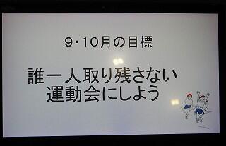 「運動会の取組を通して、まず①つは、『和』を大切にしてほしい。意見が違ったり、ぶつかったりすることがあっても、仲直りをすることが大事。そのためには、『対話』をすること。対話をしながら理解し合うことを大切に。団長、副団長を中心に、リーダーシップを発揮しながら導いていってほしいと思います。②つ目は、『準備をする』という練習を大切にしていく。運動会を目指して心と体の準備をしていってほしい。みんなでスローガン目指して、頑張っていきましょう!」