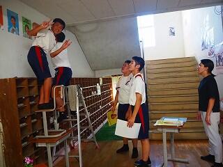 体育館は熱中症対策として、窓を開け風通しを良くし、大型扇風機を回し、体育主任の先生が見守りでついています。