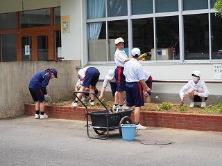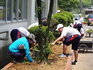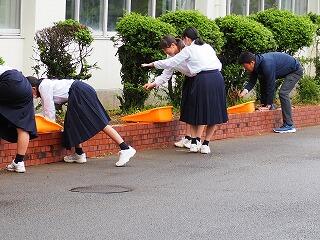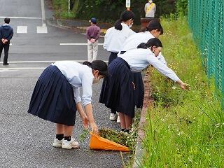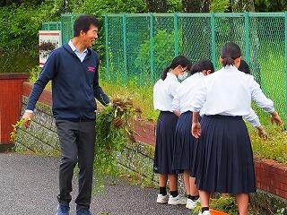 今朝は、テニス部のみなさんが花壇の草取りなどに取り組んでいました。