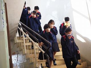 「非常ベル」が鳴り訓練開始。とても真剣に、避難訓練に臨んでいます。