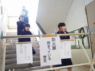 今回の訓練では火元が「調理室」の設定でしたので、火元から遠い所「体育館」へ避難しました。実際の火災の場合は、火元がどこなのかで避難経路や避難場所も変わってきます。いつ、どこにいる時に火災が起きるのかは、わかりません。だからこそ、訓練で避難の基本をしっかり確認して、緊急時には自分で判断して避難行動、命を守ることができる力を身につけます。