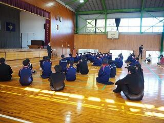 校長先生のお話。「それぞれに自分で選択した道、目標に向かって、一生懸命頑張ってきました。精一杯、力を発揮してきてください。そのためにも今日は早めに休んで、明日に備えてください。健闘を祈ります。」
