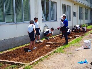 「最初の10分、今日の作業の説明をしました。その後は、それぞれに自分で考えて行動していました。次に自分は何をすればいいかなど、周りの状況や進み方なども見て、考えて行動していました。天気も良く暑くなってきた時間でしたが、自分たちで考えて、進んで作業ができるのは、本当に素晴らしい力です!」