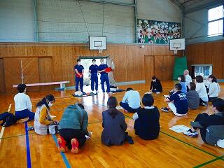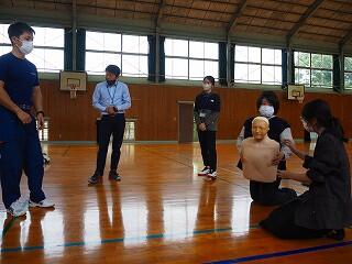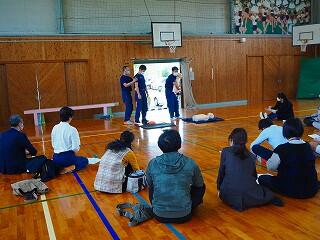 西都市消防本部の方から、のどに食べ物が詰まった時の状況や気づき方、対処法などの説明、確認がありました。