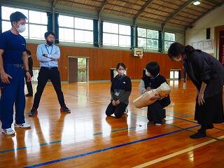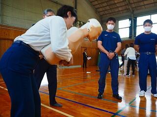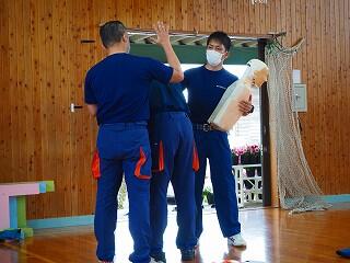 まずは、背部叩打法。背部をしっかりと、突き上げるように叩く方法を演習。