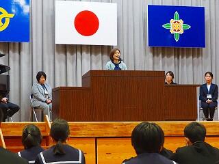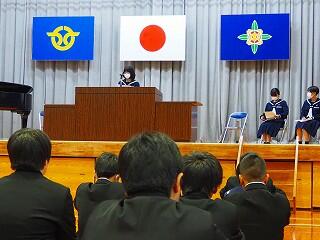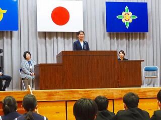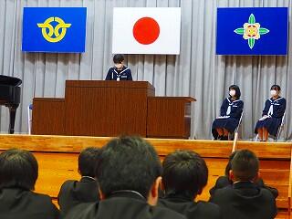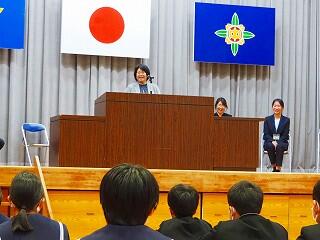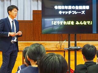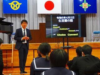 「まずは、生徒総会に向けてしっかり取り組んでいきたい。生徒会スローガン『3C』を継続して取り組んでいきたい。そのためにも、一人一人が考え、意見を出し合えること、自分から話し合いに臨んでほしい。私自身も、一人一人の意見を受けとめ、みんなが納得できる話し合いのまとめ方を目指す。また、学力向上については、取り組みを実践していきたい。あと2年、まだ2年ある。最後までレベルアップ目指していけるように、みんなでチャンスにチャレンジしていきましょう!」