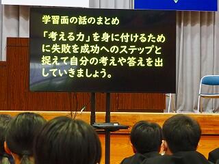 ②目標を明確にもち、自立した中学生になってほしい。『自立』の反対は『依存』。日常生活面から考えて、できる自立は自分でやっていく。レベルアップしていくことが大事。もう一つの『自律』、自分の意志で決めて自分でコントロールしていくことができるようになっていきましょう。そのためにも、まずは目標を明確にすることが大事。みんなで頑張っていきましょう!」