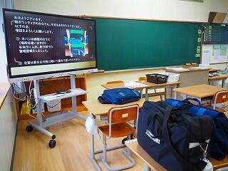 朝の習慣について。登校後の整理整頓のポイント。今後、自分たちで習慣化していくためのポイントが大型テレビに映し出されていました。それを見て、さっそく自分たちで行動していました。