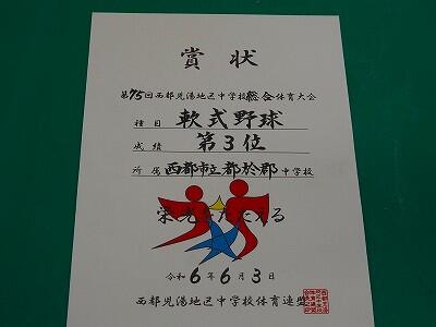 「第3位」の賞状をキャプテンが学校に校納し、野球部の皆さんを拍手で称えました。