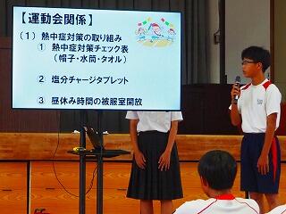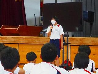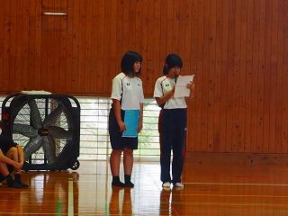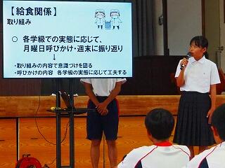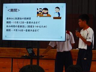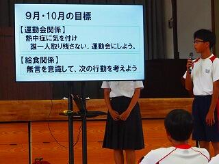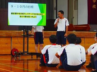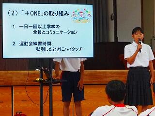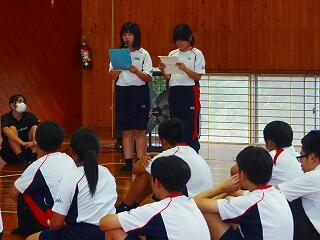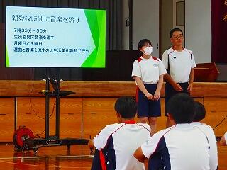 「生徒総会でみんなで決めた『 Last Year をどう取り組むのか、【+one】の取組』になるよう、中央委員会でも検討して、各専門委員会でも再度検討してもらっての提案です。都於郡中の一人一人が【+one】を意識して、考えて、みんなで取り組んでいきましょう。」