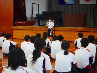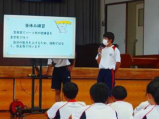 昼休み時間のリハーサルでは、生徒会担当の先生から「前期最後の生徒会集会です。前に出てプレゼンを読むだけではなく、後期の人たちに受け継いでいってもらいたい姿をしっかり見せて、大切なことをつないでいけるように頑張りましょう。」と、前期の生徒会役員の気持ちの確認をして、本番を迎えました。