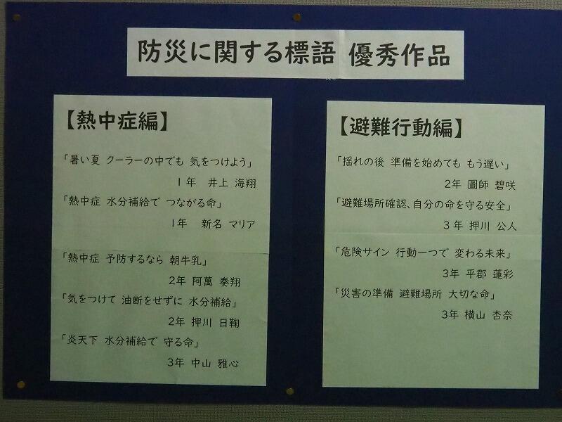 7月に実施した防災に関する集会で、『防災に関する標語』を募集しました。たくさんの良い作品の中から、優秀作品9点を厳選しました。その表彰を行いました。
