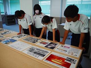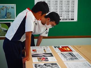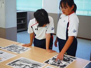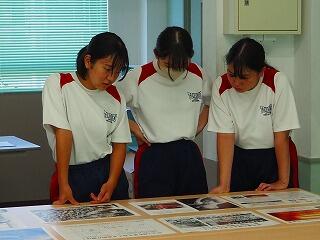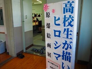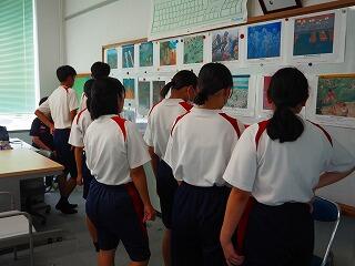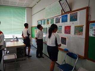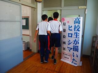 平和学習の意識を高めるため、「高校生が描いた原爆の絵画展」が、パソコン室に展示されています。