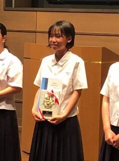 「ステージに上がったら緊張して、途中で止まったり、噛んでしまったりもしたけど、今までの練習を思い出して最後までしっかり発表することができました。結果、優秀賞だったので、とてもうれしかったです。英語科の先生が夏休みからずっと指導してくださって、ありがたかったです。感謝です。」