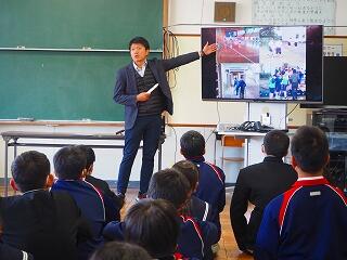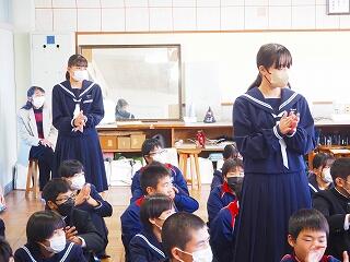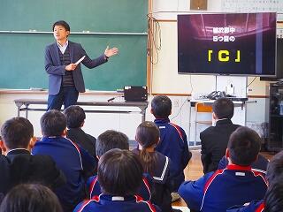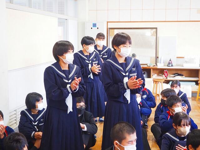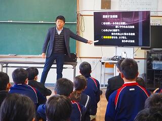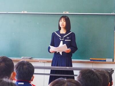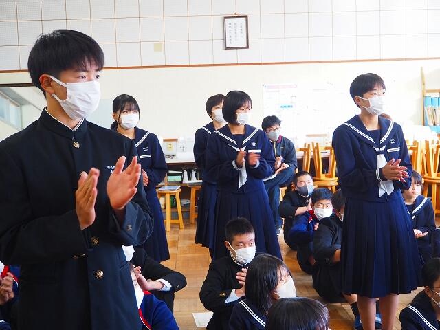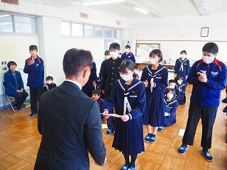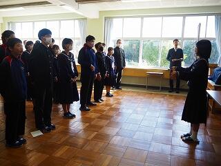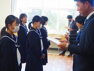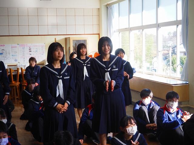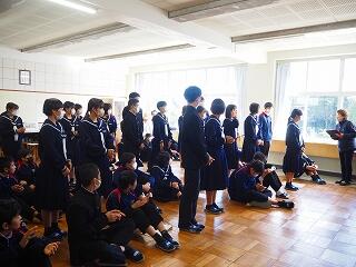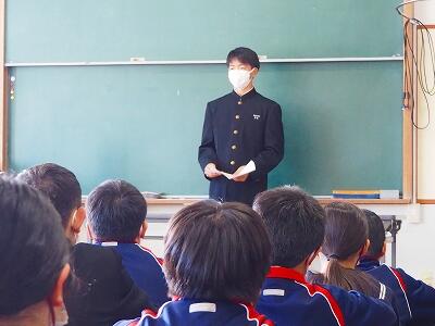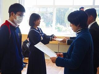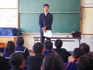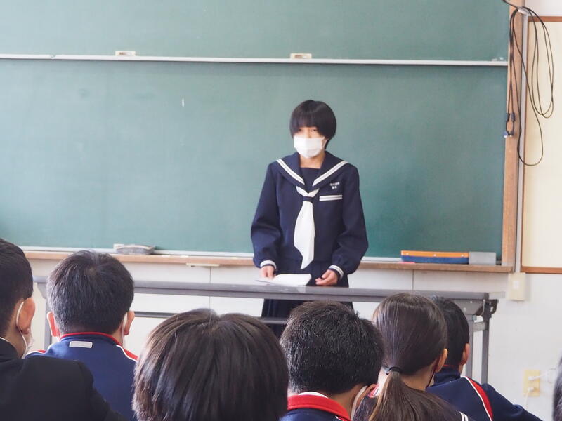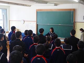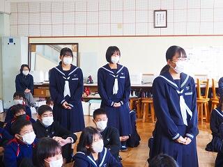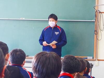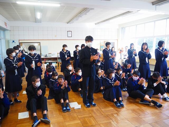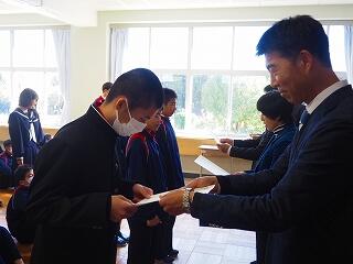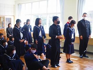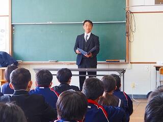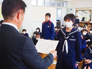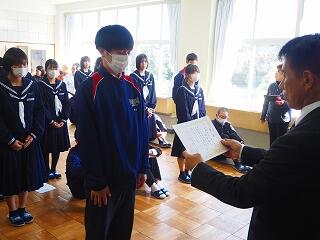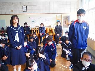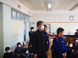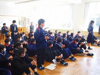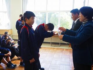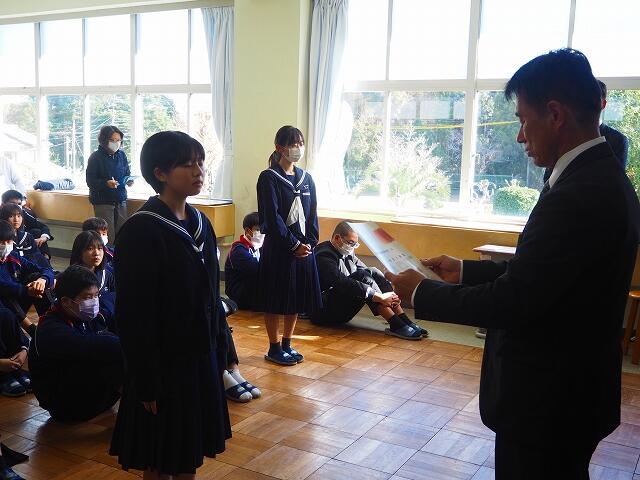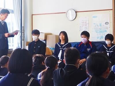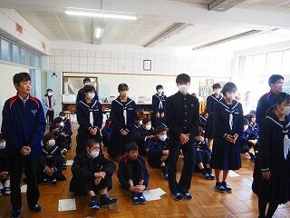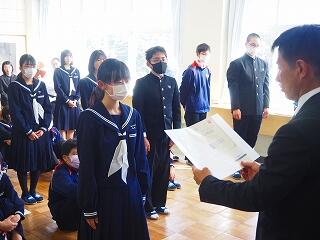 「2学期も様々な行事や活動があり、みなさんの発表、表現、協力する姿、最後まであきらめない粘り強い姿に感動しました。冬休み中は家族の一員として、手伝いなど自ら進んでやってほしいと思います。3年生は、自分の進路の実現に向けて頑張ってください。元気に1月9日に会いましょう!」