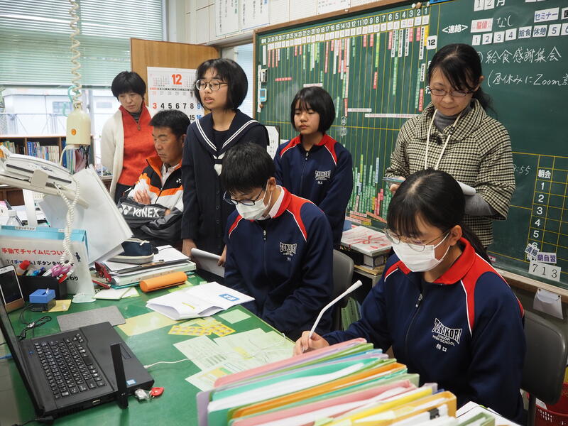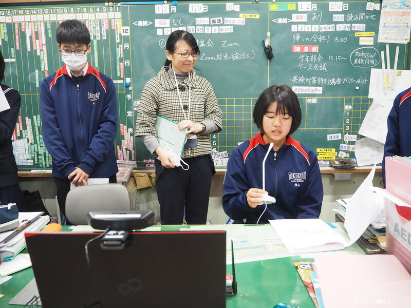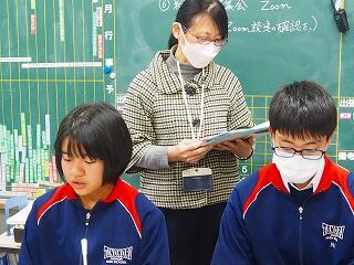 Zoomでの集会の進行終了後「緊張しましたー!」と、まだ緊張感が残っている4人に、栄養教諭の宮原先生から 「進行もとっても上手でしたよ!ごくろうさまでした。」と、ねぎらいの言葉をかけていただきました。