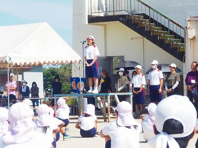 「リーダーとして声を出し、みんなをまとめることが普段の生活より自分なりに頑張ることができました。例えばリーダーシップとしての声の出し方や、応援の時に下級生を引っ張りまとめることなど、仕事が沢山あり大変だったけど、みんながついてきてくれたおかげでスムーズに進めることができました。また、中学校3年生と小学校6年生は最後の運動会だったけど、練習の時からみんな一生懸命で負けていてもあきらめず全力だったから、応援の部で優勝がとれて最高の運動会になったと思います。3年生になっても今まで学んだことを生かせるよう日頃から声を出して頑張っていきたいです。」