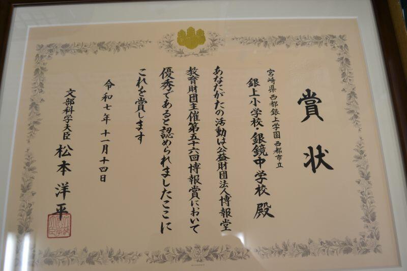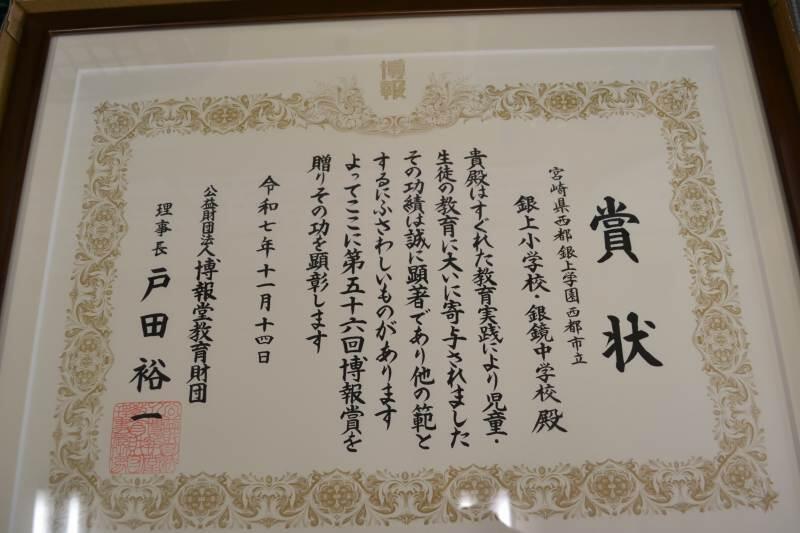 博報堂教育財団の第56回「博報賞」におきまして、西都銀上学園が博報賞・文部科学大臣賞を受賞しました。これまでの学校や地域の皆様の取組が評価されました。