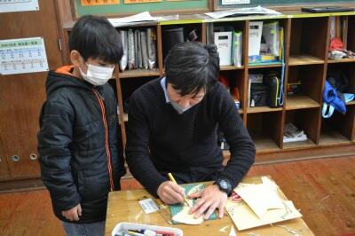 カッターの使い方を担任の先生に丁寧に教えてもらいながら、慎重に取り組んでいました。
