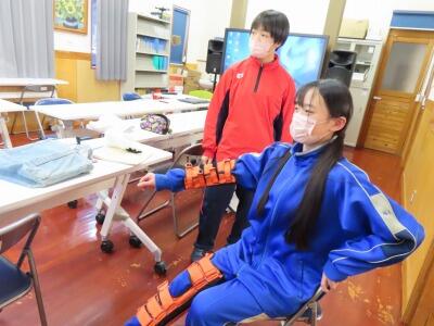 次に、中学1年生!東米良仁の里に出向いて、福祉体験学習を行いました。東米良仁の里を運営する善仁会が行っている福祉事業のお話や高齢者疑似体験活動を通して、福祉の大切さについて学ぶことができました。
