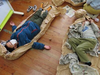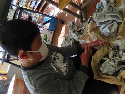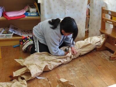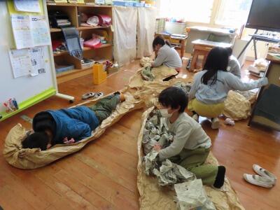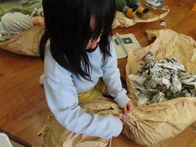 まずは小学生2~4年生!クラフト紙をぐちゃぐちゃにして柔らかくし、紐でギュっと結ぶ紙遊びをしました。楽しそうに活動していました。