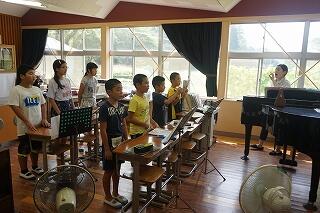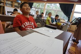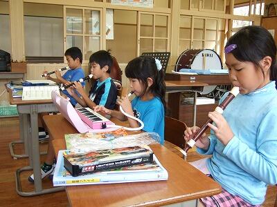 小学3・4年生の音楽です。演奏する曲の練習をしています。楽譜を一生懸命読んでいますね。