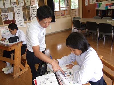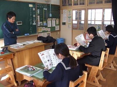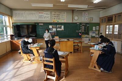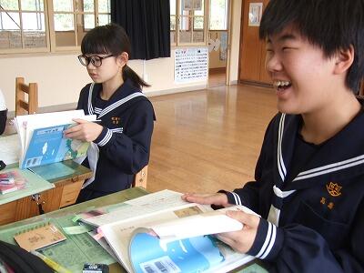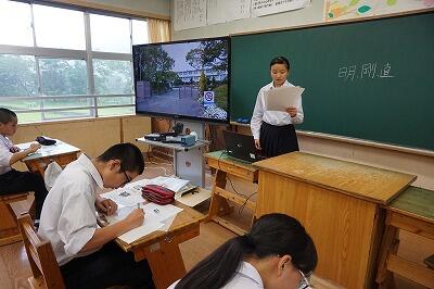 中学2年生は英語の授業。「How did this word change?」の先生の質問を辞書で調べたり発表したりして、原型、現在進行形、過去形などをしっかり覚えていました。