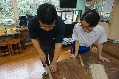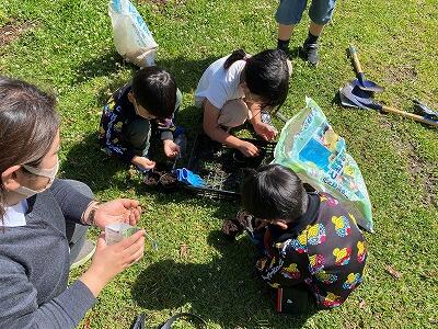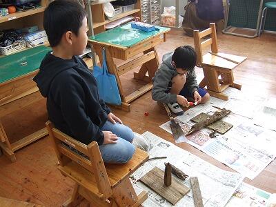 3・4年生は拾ってきた枝や板切れを使って工作。どんなものができるか楽しみです。