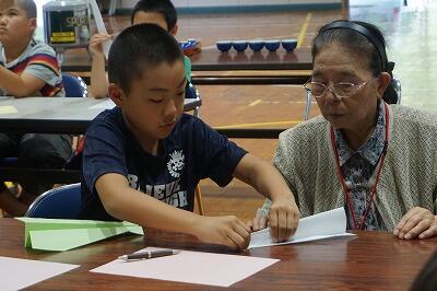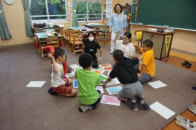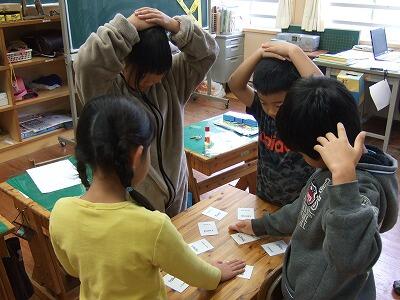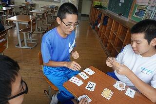 小学1年生から4年生は外国語の学習で発音を聞いてその発音の使われているスペルの単語を選ぶという難しいカルタ遊びに挑戦しました。ゲームが進むたびに、スペルと発音を結びつけて考えることが素早くできるようになっていました。