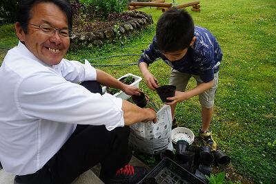 6年生の理科です。花壇に生えていたホウセンカを植え替えています。花壇の草も夏らしく元気いっぱいです。