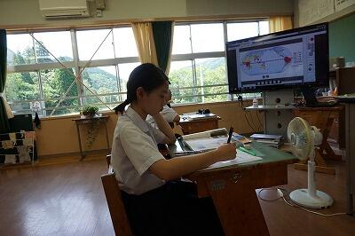 中学2年生の社会です。気候の学習を行っています。難しい内容ですが先生と一緒に頑張って考える姿が見られました。