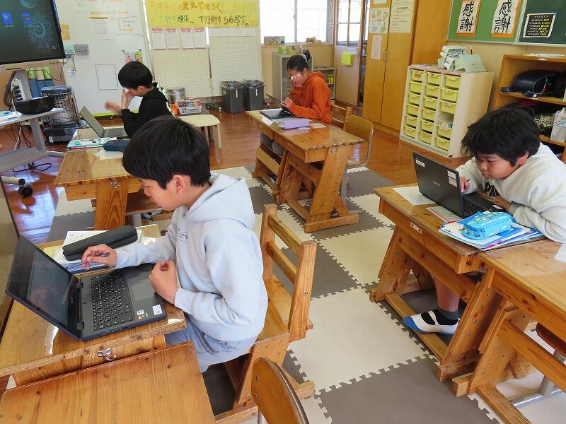 4年生は、国語の学習です。アンケート整理に取り組んでいます。結果からの考察、分からない言葉の意味調べなどなど、今まで学んできた力を存分に発揮させながら、頑張っています。
