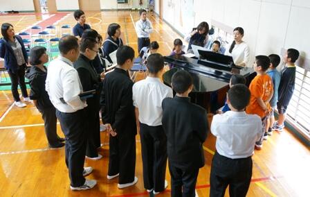 歌う前にみんなで体と心をほぐしています。先生方も混ざって、楽しそうですね。
