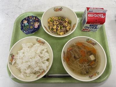 今日の献立は、麦ごはん、牛乳、そうめん汁、三色丼、七夕ゼリーでした。