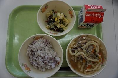 今日の給食は、減量麦ごはん、山菜うどん、プレーンオムレツ、ゆでもやしでした。