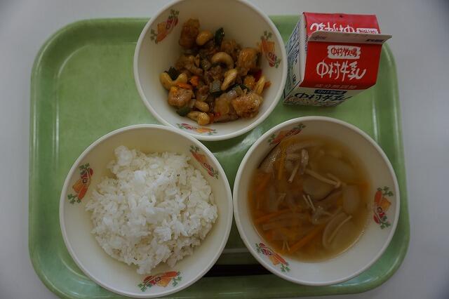 麦ごはん、牛乳、千切り野菜のスープ、鶏肉とカシューナッツの揚げ煮