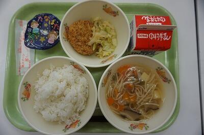 麦ご飯、豚肉と野菜のコンソメ煮、コロッケ、ドレッシング和え、牛乳です。