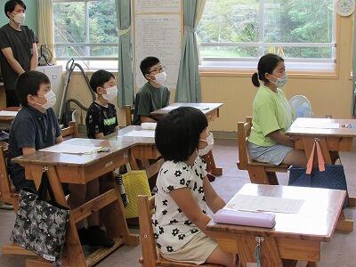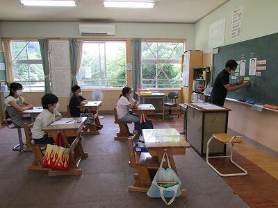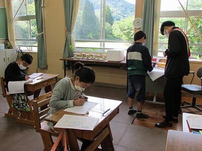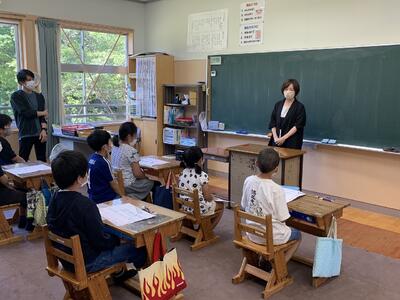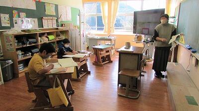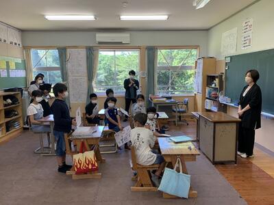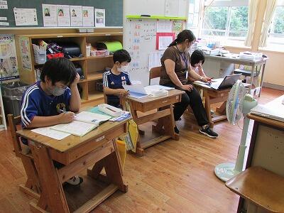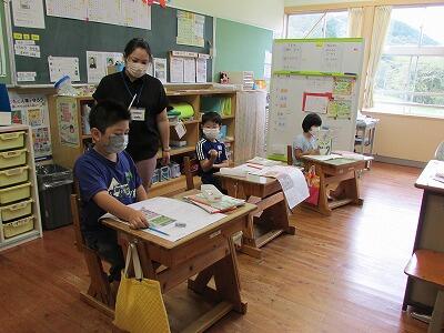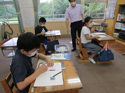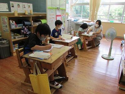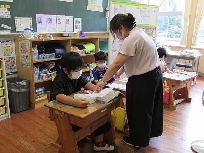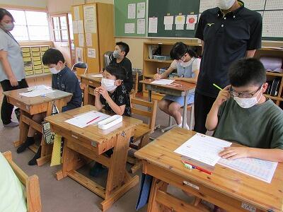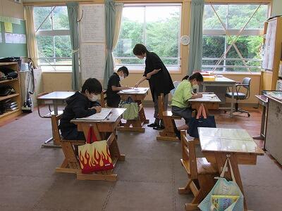 小学1・3年生の国語の様子です。1年生は、新出漢字をドリルノートで復習しました。「くじらぐも」の音読をし、5つの場面にそれぞれどんなことが書かれているかまとめました。3年生は新出漢字を学習しました。筆順と形に気をつけて丁寧に書きました。「ちいちゃんのかげおくり」のあらすじを話し合ってまとめました。